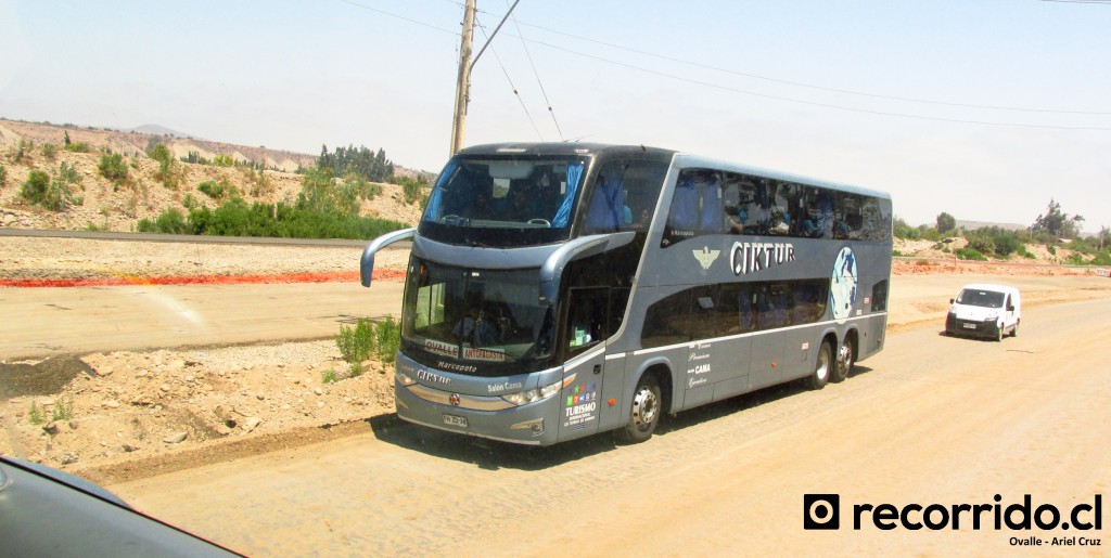El bus de nuestra empresa ingresó a Los Vilos, hay una especie de calle lateral a la carretera donde van parando los buses de distintas empresas para tomar/dejar pasajeros en esta pequeña ciudad. Cuando continuamos la marcha hacia el norte e íbamos a ingresar a la Panamericana, tuvimos un cruzamiento con otro bus de Ciktur que iba hacia Santiago.